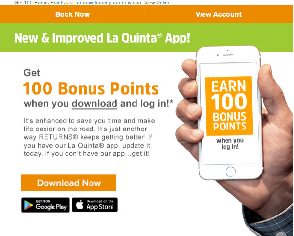 Deals & Discounts | La Quinta by Wyndham - Wyndham Hotels Limited-Time Offer: Earn Points for up to 8 Free Nights. With the Wyndham Rewards Earner® Cards, you can earn up to 60,000 bonus points—enough for up to 8 free nights at thousands of Hotels by Wyndham. Plus, get a 0% introductory APR on all purchases made in the first 12 months. See Terms & Conditions for details. Learn More. Avis - TIME TO UNWIND Now through December 31, 2017, La Quinta Returns members can earn 250 bonus points on qualifying rentals of 2 days or more at participating Avis locations in the U.S. and Canada.; Use coupon # MUHA073 and provide your La Quinta Returns number at the rental counter to earn your points. This offer is in addition to your everyday savings of up to 30% off Avis base rates when you use AWD # K376500.