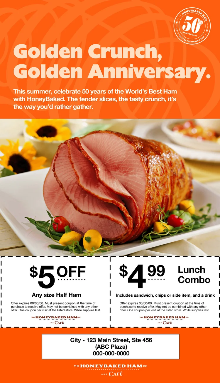 $25 Off Honeybaked Ham Coupons & Promo Codes | November 2022 15% Off with Honeybaked Ham Discount Code. Get 15% Off On Shipping On Purchases of $80 or More. Reveal Code. 15% Off. Code. 15% Off with Honeybaked Ham Coupon Code. Save 15% Off Honey Baked™ Quarter Ham Dinner, Bone-in Quarter Ham, Boneless Half Ham, Or Honey Baked™ Turkey Breast Dinner. Reveal Code. $5 Off. Honey Baked Ham Coupon Code: 6 New Honey Baked Ham in store Coupons At 6 New Honey Baked Ham in store Coupons At participating locations. Expires: 12-31-2019. Turn Device Sideways to see Wide In-Store Coupon. Show device to store at register. Most coupons are valid only at participating locations and not valid in AK, HI, PR or outside the USA. One coupon per person per visit. Not valid with other offers or coupons. Coupons.com: Online Promo Codes and Free Printable Coupons Use Coupons.com for the best deals and biggest discounts when you shop online and in-store. Save money on every order with the most current promo codes, rewards, and free shipping offers.